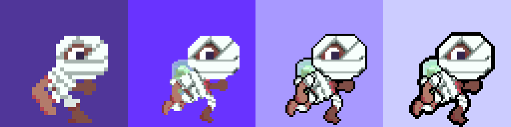 I continued converting my main character to 64x64, but at the same time I wanted the black border around the player to be a bit thicker. I also wanted to add a 1px border between the different layers. I already had a script to outline the whole image for Aseprite, so I created another one specifically to add a 1px border around each layer as well. The Aseprite scripts are open source and free to grab from the link below if you want them